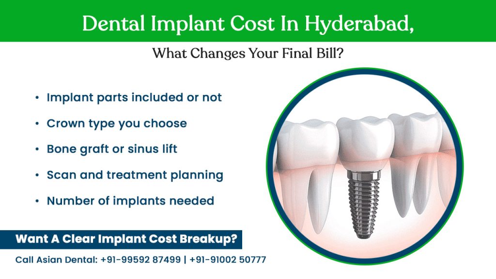 This guide explains the dental implant cost in Hyderabad to cure your problem. You will see price ranges between ₹20,000 to ₹60,000 based on type, what is usually included, what is charged separately, and what changes the final cost.